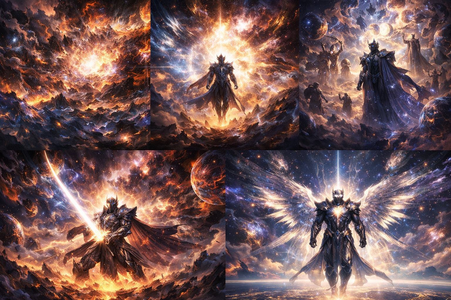 The collapsing galaxies surrounding the Convergence hardened into his celestial armor, symbolizing endurance. The dying stars transformed into radiant wings, granting him the ability to traverse infinite dimensions. From the core of the Convergence, he forged his weapon ā the Blade of Equilibrium, a manifestation of restoration rather than destruction.